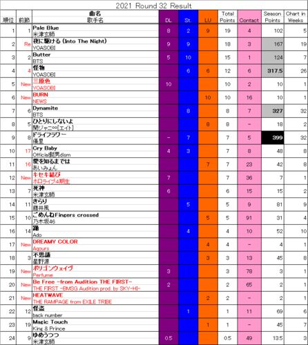2021シーズン第32節(6月28日~7月4日)結果 昨シーズンとなる2020年度から大幅に仕様変更を行ったGreen Hill Music Chartですが、今季は新たに長期に渡りチャートインしている曲に対してポイント獲得条件を付け、チャートの活性化を促進する「リカレント…