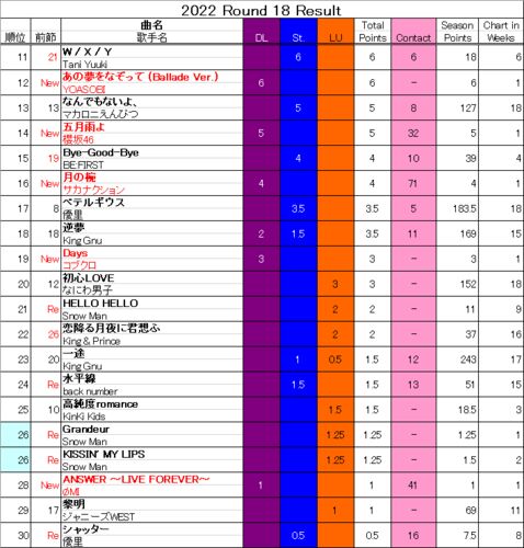 2022シーズン第18節(3月28日~4月3日)結果 昨シーズンから導入した「リカレント・ルール」について、今季は仕様変更を行い獲得ポイントについても制限を設けました。詳しくはリンクをご覧ください。 amano-yuuki.hatenablog.jp また、このチャートで用…