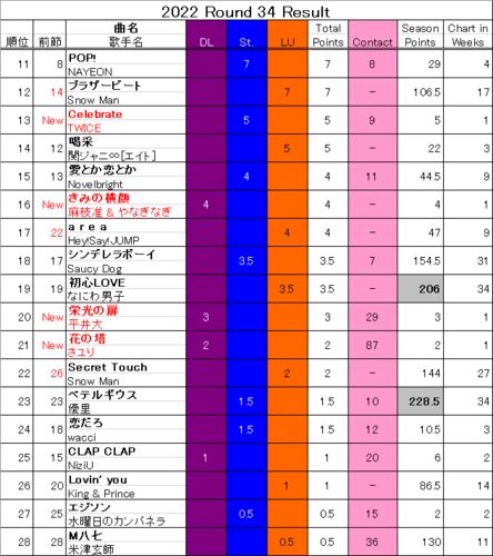 2022シーズン第33節(7月11日~7月17日)結果 昨シーズンから導入した「リカレント・ルール」について、今季は仕様変更を行い獲得ポイントについても制限を設けました。詳しくはリンクをご覧ください。 amano-yuuki.hatenablog.jp また、このチャートで用…