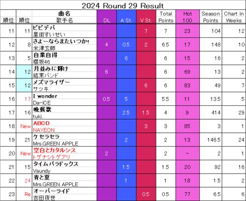 Green Hill Music Chart 2024 第29節結果
