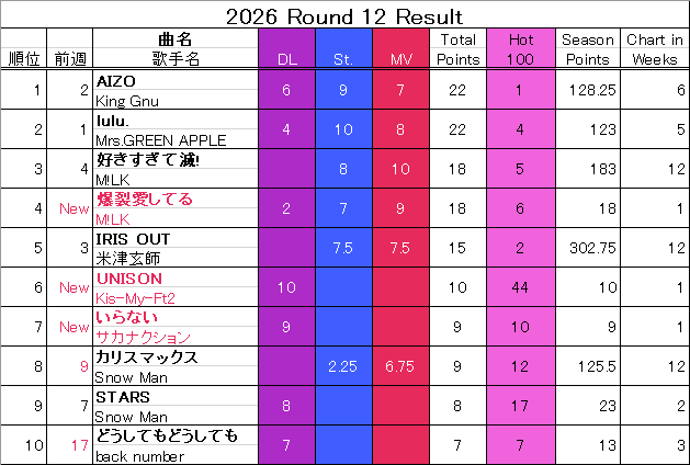 今週は今季ここまでで最多となる24曲がポイントを獲得。今週からMVでリカレント・ルールが適用されている「JANE DOE」が前節からポイントを伸ばし11位に再浮上。MV再生数が再び伸びており、何等かのきっかけが有ったものと見られる(要因は不明)。