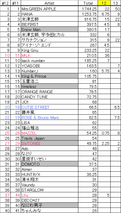 それでは今週の結果を受けて、アーティストランキング上位40組はこのようになりました(ポイントの増減に伴う順位変動に対し赤文字、青文字表記)。